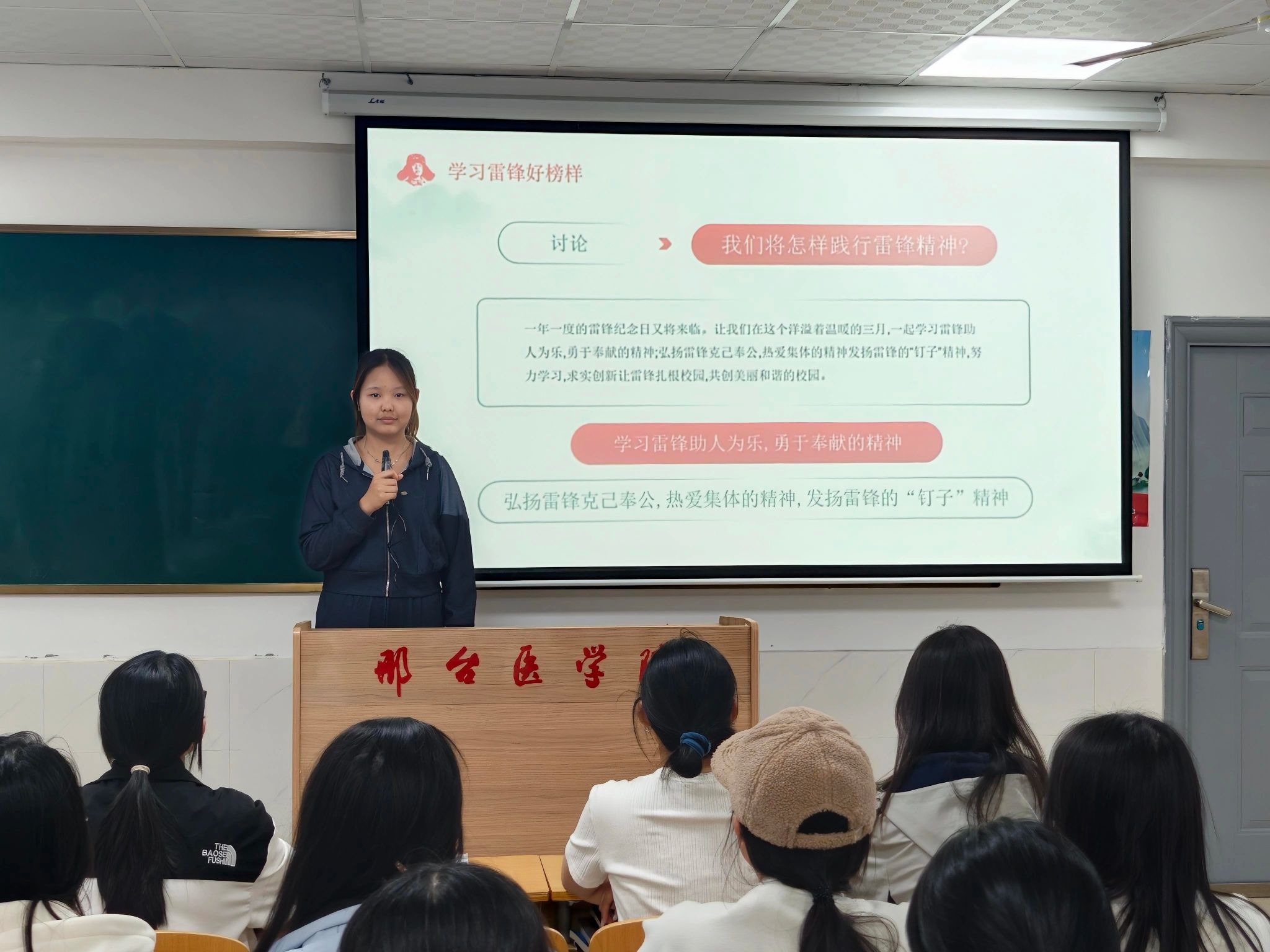 最后,主讲人向全体团员发出行动倡议,号召大家以雷锋为榜样,传承助人为乐、勇于奉献的优良品质,秉持克己奉公、热爱集体的责任担当,发扬“钉子精神”刻苦学习、求真务实,从身边小事做起,积极参与志愿服务,用实际行动让雷锋精神落地生根,让志愿薪火代代相传。