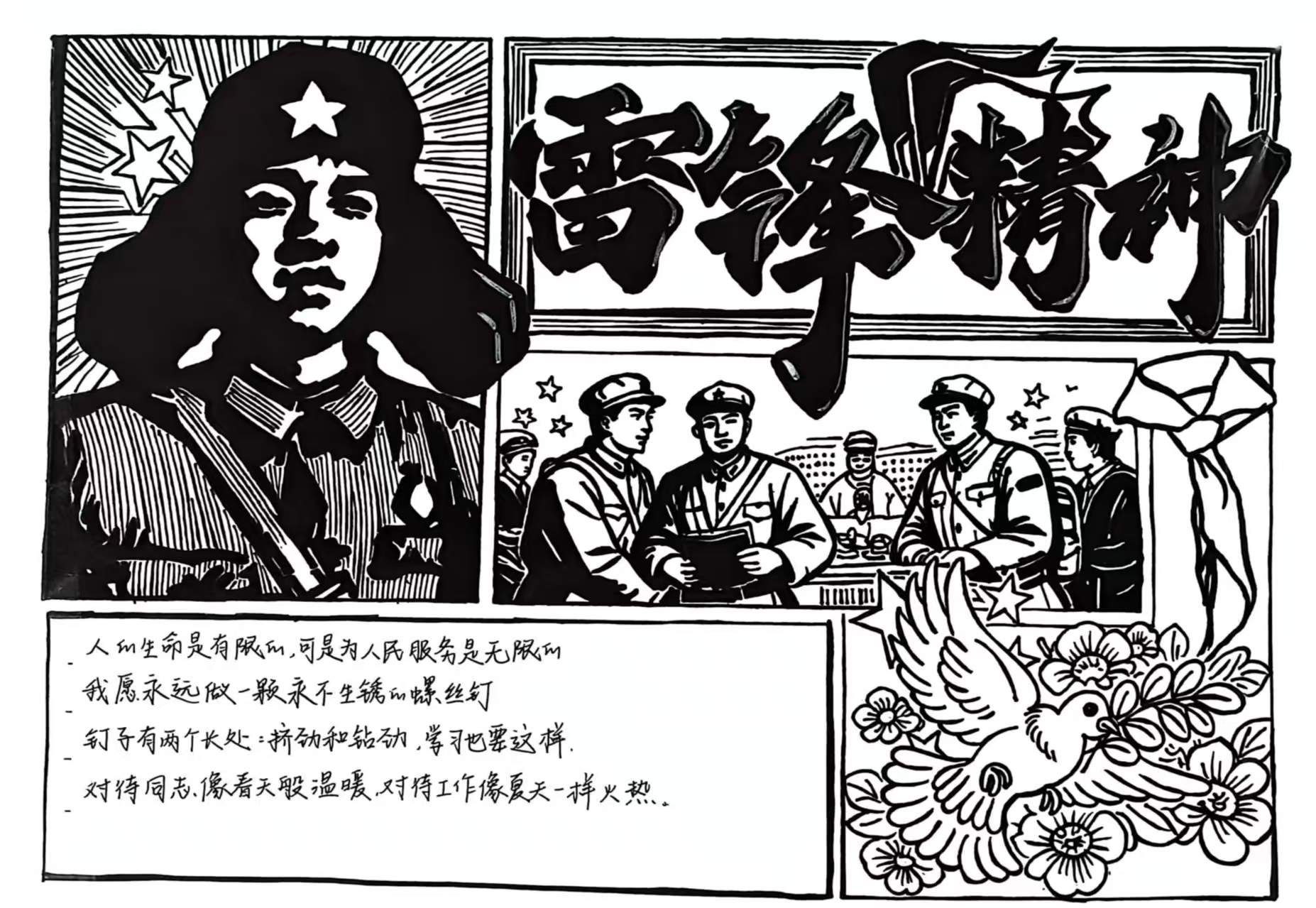 活动期间,护理系学子积极参与创作,以书法、版画、线描等形式抒发感悟。书法作品笔力遒劲、气韵流畅,以传统笔墨书写青年担当,尽显向雷锋同志看齐的赤诚;绘画作品以黑白线条勾勒雷锋形象与志愿服务场景,构图质朴生动,将“螺丝钉精神”具象化,彰显护理学子立足岗位、服务他人的初心。