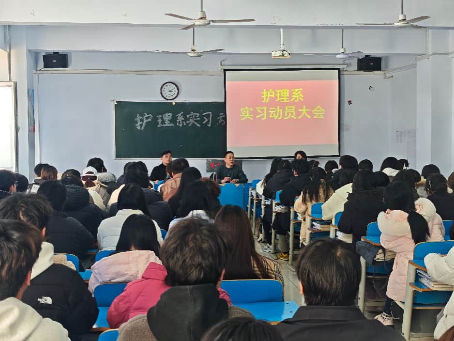 近日,护理系2024级实习动员大会在二号教学楼107室召开。参加大会的有51名实习班长加上24级实习班各班代表共近百人。大会由护理系党总支副书记王军波牵头组织,所有实习班级辅导员共同参与。